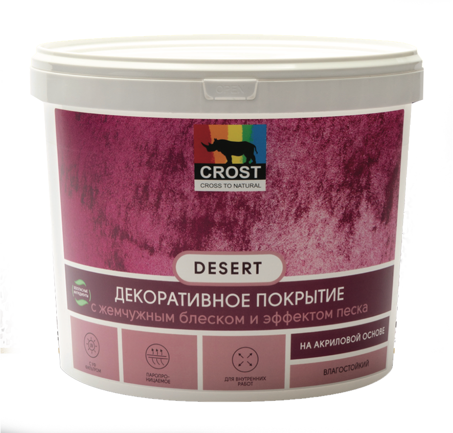Декоративное финишное покрытие на акриловой основе для внутренних работ и сухих помещений, с металлизированными пигментами и специально обработанной кварцевой пылью. Crost® Desert придает стенам эффект античной ткани, имитирует роскошь переливающегося шелка с рельефом и мягким металлическим отблеском и переливами, меняющимся в зависимости от освещения. Идеально подходит как для классического, так и для современного интерьера. Материал изготовлен на водной основе, не имеет запаха, абсолютно не токсичен, отличается высокой устойчивостью к различного рода воздействиям. Наносится на различные виды предварительно подготовленных поверхностей: бетон, цементные и гипсовые штукатурки, гипсокартон. Цветовая гамма – базы Silver (серебряная), Gold (золотая) и Matt (матовая). Колеруется любыми органическими красителями по системе Crost, NSC, Ambiance.