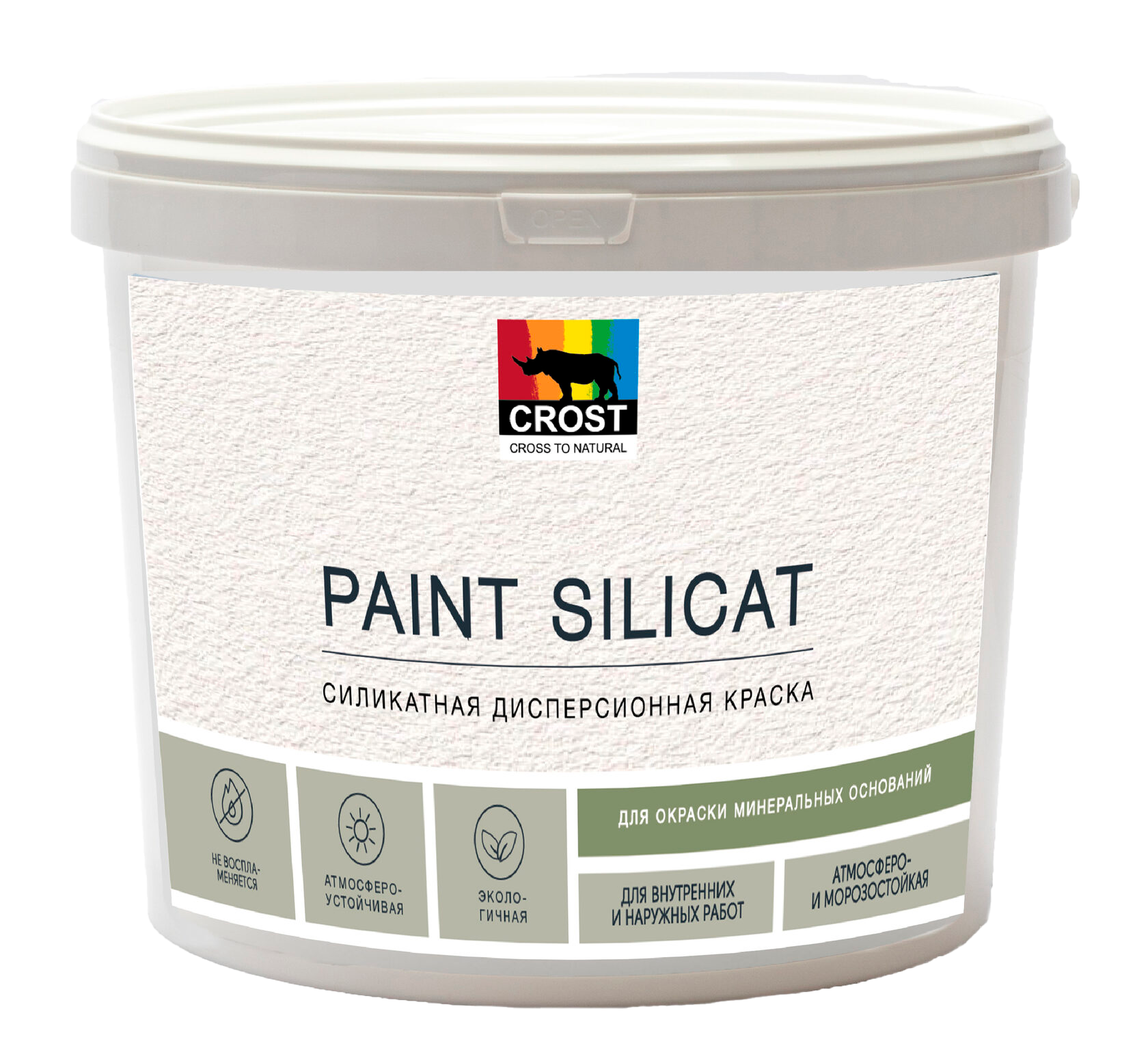 Дисперсионная силикатная краска Crost® Paint Silicat предназначена для окраски минеральных оснований (известковых, известково-цементных, цементно-песчаных штукатурок и шпаклевок, кирпичей, бетона и других оснований, кроме гипса). Используется для фасадных и интерьерных работ, в том числе зданий, имеющих статус памятников архитектуры, для жилого сектора, школьных и дошкольных учреждений и прочих общественных зданий.