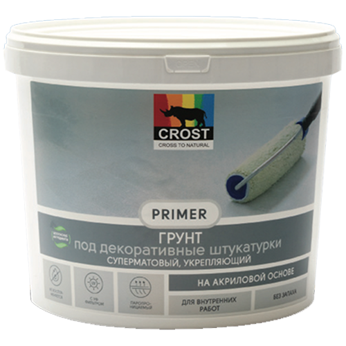 Работы следует проводить при температуре от +15 до +36С и влажности воздуха не более 80%. При работе следует использовать кисть, валик (средний ворс). Подготовка поверхности должна соответствовать стандарту К2-КЗ по Таблице 7.5 СП 71.13330.2017 CM. Поверхность должна быть сухой, ровной, прочной, очищенной от пыли, высолов, жиров, известкового налета и других загрязнений. Новые цементные поверхности должны быть выдержаны в течение 30 дней. По необходимости выровнять поверхность с помощью финишной шпаклевки. Нанести один слой грунта Crost® Primer кистью, валиком. Через 2-6 часов загрунтованную поверхность можно перекрывать последующими отделочными материалами.