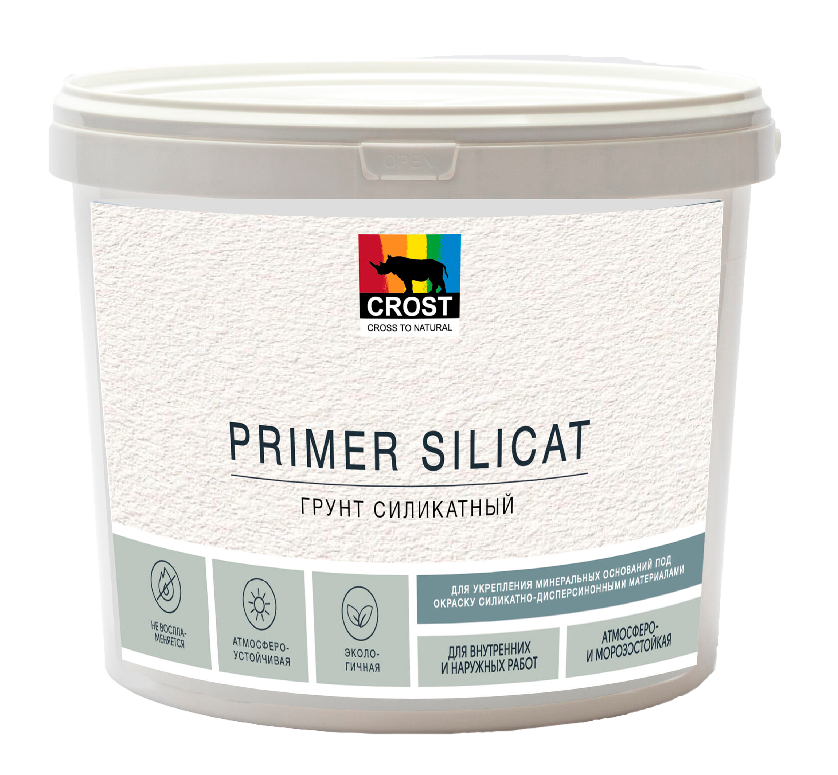Силикатный грунт Crost® Primer Silicat предназначен для подготовки основания под окраску силикатно-дисперсионными материалами Crost®. Грунт укрепляет минеральные основания (известковые, известково-цементные, цементно-песчаные штукатурки и шпаклевки, кирпичную кладку, бетон и другие основания, кроме гипса), способствует выравниванию их впитывающих свойств. Может использоваться межоперационно для закрепления штукатурных оснований. Используется для фасадных и интерьерных работ. Может применяться на путях эвакуации.