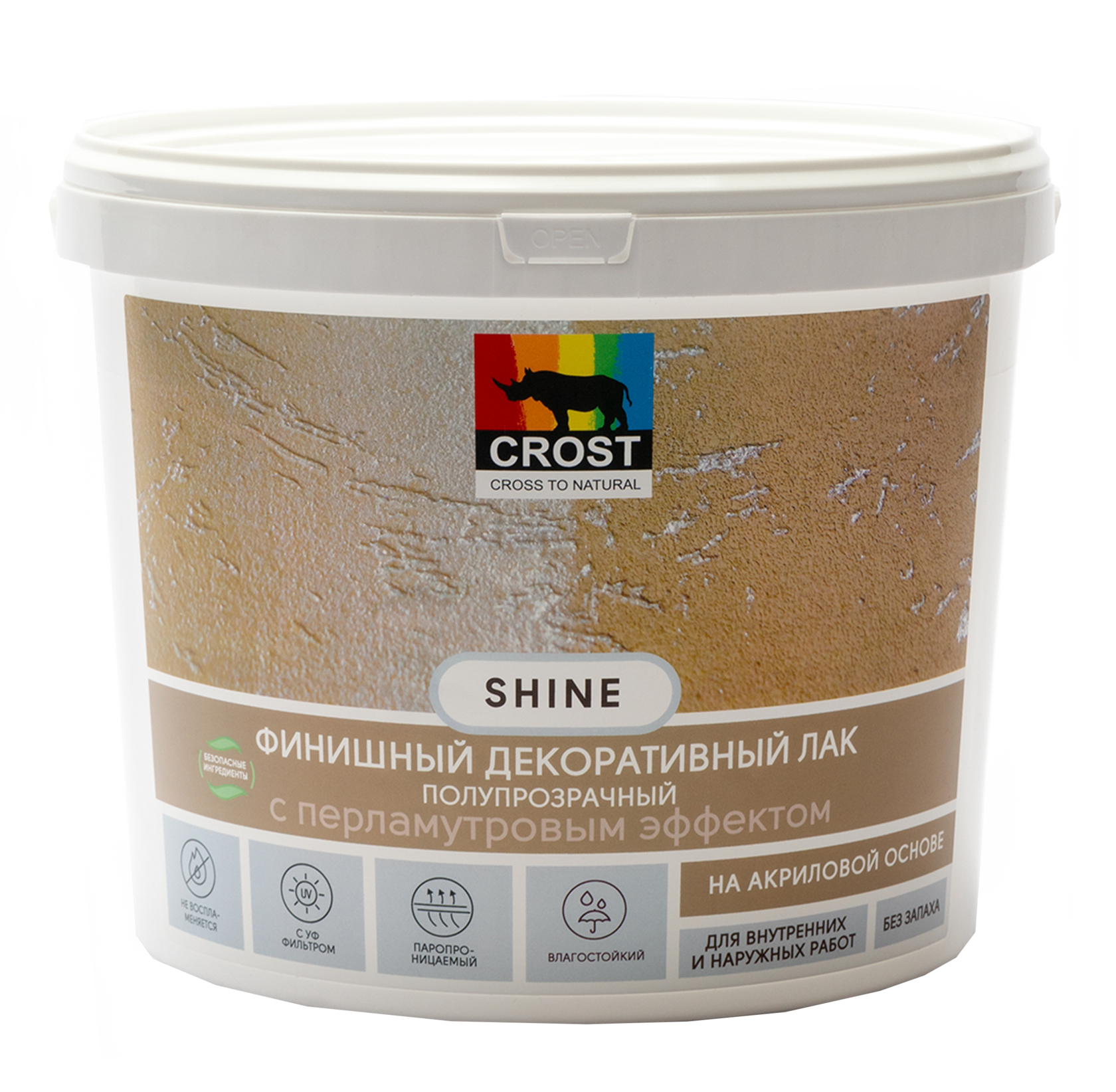 декоративное полупрозрачное покрытие с эффектом сияния и перламутра. Благодаря своей уникальной формуле выступает как самостоятельный материал с широким спектром визуальных эффектов, так и вспомогательный финишный лак в системе декоративных материалов Crost®, давая хорошую защиту от воды. Абразивостойкое покрытие. Предназначено для внутренних и наружных работ, наносится финишным слоем на декоративные материалы – краски и штукатурки Crost® на известковой и акриловой основе. Цветовая гамма: базы Silver (серебряная) и Gold (золотая). Колеруется органическими красителями по системе Crost, NCS, Ambiance.
